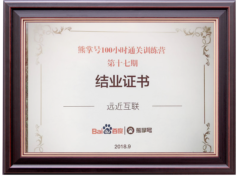 遠近互聯榮獲百度官網認證“熊掌號訓練營結業證書”